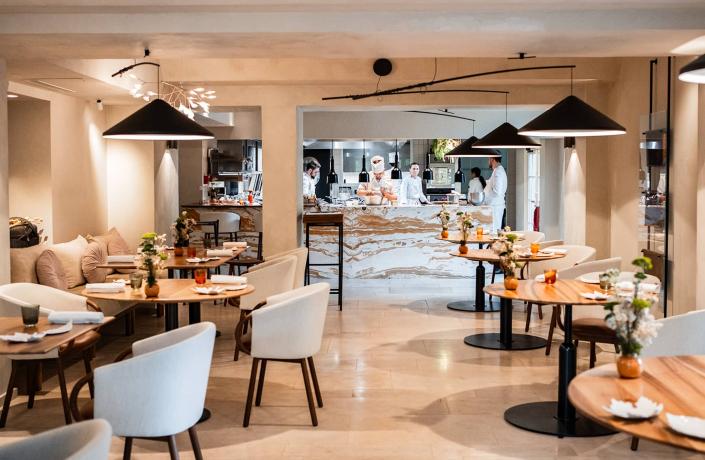 environnante. Salle aux camaïeux marron glacé, éclairage tamisé, tables en