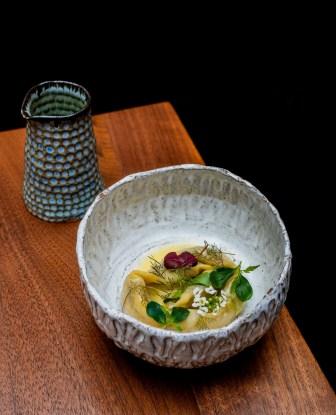 et en ravioles aux pommes de terre, accompagné d’une sauce livèche qui